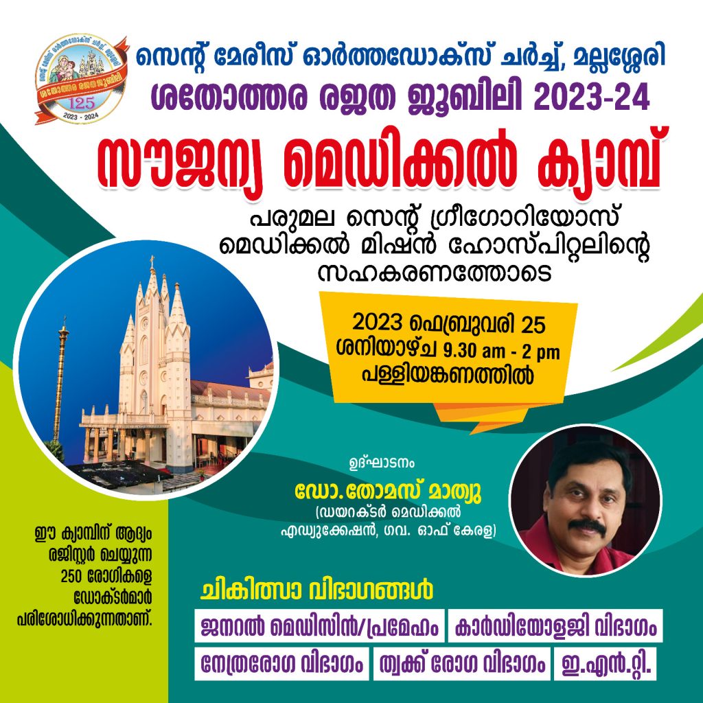 A free medical camp is scheduled at the church premises on February 25, 2023, in association with St. Gregorios Medical Mission Hospital, Parumala.