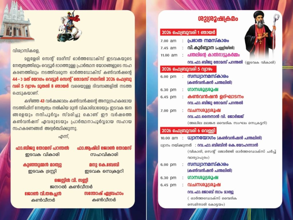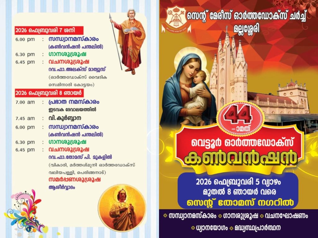 മല്ലശ്ശേരി സെന്റ് മേരീസ് ഓർത്തഡോക്സ് ഇടവകയുടെ നേതൃത്വത്തിലും വെട്ടൂർ ഭാഗത്തുള്ള പ്രാർത്ഥനാ യോഗങ്ങളുടെ സഹകരണത്തിലും നടത്തിവരുന്ന ഓർത്തഡോക്സ് കൺവൻഷന്റെ ഈ വർഷത്തെ യോഗം 2026 ഫെബ്രുവരി 5 മുതൽ 8 വരെ നടത്തപ്പെടുന്നു. വിശദമായ നോട്ടീസ് ചുവടെ ചേർക്കുന്നു.